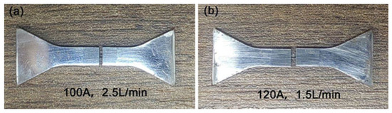 The tensile fracture samples were prepared under different process parameters: (a) 100 A, 2.5 L/min, and (b) 120 A, 1.5 L/min.