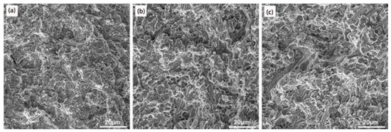 Figure 14 shows the macroscopic appearance of the tensile fracture sample prepared under an arc current of 100 A and an ion gas flow rate of 2.5 L/min, Figure 14a, and an arc current of 120 A and an ion gas flow rate of 1.5 L/min, Figure 14b. The tensile fracture surfaces of the samples with the highest and lowest strength are located in the middle of the welding layer, and the connection region between the welding layer and the substrate is well bonded, without any fracture. The macroscopic fracture in Figure 14 shows no significant elongation, bending, or necking, and in the fracture morphology under three different surfacing processes shown in Figure 15, obvious cracks and river-like patterns propagate towards the grain. Determine whether the tensile fracture mode of the overlay layer is a brittle fracture. This is due to forming a network of brittle phases (M7C3) during the surfacing process. Therefore, under external forces, these network brittle phases will directly bear the load, which is easy to break and form cracks, causing cracks to propagate along grain boundaries, resulting in intergranular fracture of the surfacing layer.