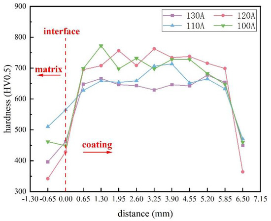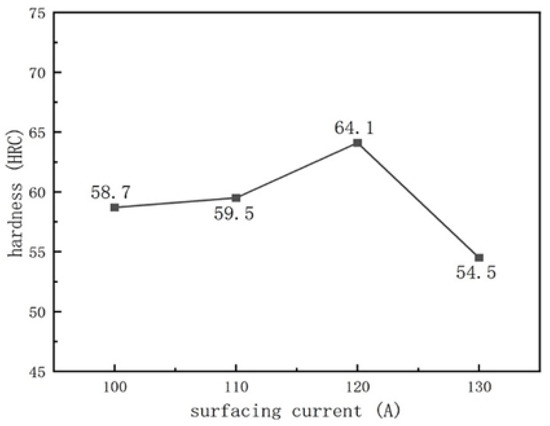 Figure 16 and Figure 17 show the variation curves of the surface hardness with arc current and ion gas flow rate, respectively. According to the analysis of Figure 16 and Figure 17, as the arc current and ion gas flow rate increase, the surface hardness of the welding layer first increases and then decreases. In Figure 16, when the arc current is between 100–120 A, the distribution of hard phases (VxCy, M7C3) in the coating is more uniform due to the full melting of the powder. Therefore, the surface hardness of the welding layer slightly increases with the arc current, but the change is not significant. Compared to the surface coatings prepared at 100 A–120 A, the surface hardness of the coating prepared at 130 A significantly decreases, plausibly due to the excessive heat input caused by the excessive arc current, which increases the dilution rate of the surfacing layer and changes the distribution of hard phases due to atomic diffusion, resulting in a decrease in the surface hardness of the surface layer when the arc current is 130 A [30].