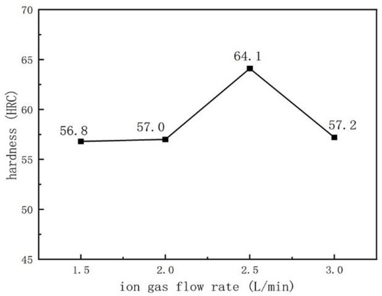 Figure 17 shows that the plasma arc is stable when the ion gas flow rate is 1.5–2.5 L/min, with moderate stiffness and uniform phase distribution. Especially when the ion gas flow rate is 2.5 L/min, the surface hardness of the surface coatings is the highest, reaching 64.1 HRC, which is consistent with the uniform distribution of hard phases in Figure 6. When the ion gas flow rate increases to 3.0 L/min, the hardness of the surface layer decreases, which may be due to higher arc stiffness and melting depth, increasing the dilution rate and decreasing the hardness.