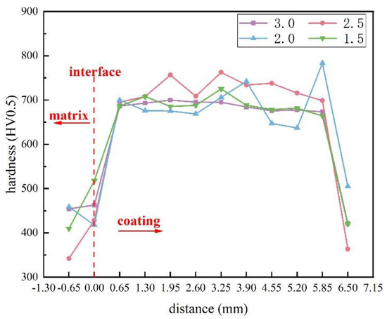 Figure 18 and Figure 19 show the cross-sectional hardness of surface coatings prepared under different currents and ion gas flow rates. Due to the in-situ generation of VxCy and M7C3 hard phases during plasma surfacing, the hardness of the surface coating is significantly higher than that of the 42CrMo steel substrate. In Figure 18, the hardness at the fusion line of the surface layer prepared under 120 A is significantly lower. As shown in Figure 8b, the molten pool formed at 120 A is subjected to a higher temperature, facilitating the diffusion of the low-melting-point Fe phases, resulting in a wider fusion zone and an increase in the dilution rate, thereby reducing the interfacial hardness [27]. In Figure 19, there is no significant difference in the hardness of the fusion zone of the surface layer prepared under an ion gas flow rate of 2.0–3.0 L/min. When the ion gas flow rate is 1.5 L/min, the fusion interface hardness is the highest. This may be because, as the ion gas flow rate increases, the plasma arc stiffness and the melting depth increase, making the dilution faster and changing the distribution of the hard phase [31]. Therefore, the fusion interface hardness of the surface layer prepared at 1.5 L/min is significantly higher than that of the surface layer prepared at 2.0–3.0 L/min.