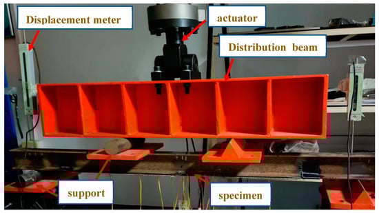 The loading device for this experiment is shown in Figure 3. The specimen bears a symmetrical concentrated load during the experiment, with a load action spacing of 500 mm and a loading point of 100 mm from the support. In the early loading stage, the experimental phenomenon of the components was not significant, so the design loading increased by 6 kN per stage. When the structure approached the yield load, the loading load decreased to 3 kN per stage, and the loading speed should be slow and uniform throughout the entire process. From the beginning of loading to the end of loading, it should be controlled at 3 min, and after loading is completed, the load should be held for 10 min before continuing to load. The location of the strain gauge is shown in Figure 3.