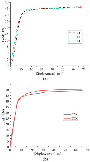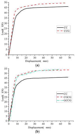 Comparison of load-displacement curves of specimens reinforced with GFRP fabric instead of CFRP. (a) load-displacement curves of CG, GC and CC; (b) load-displacement curves of CGG and CCG.
