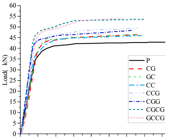 We designed control specimens with the same number of CFRP reinforcement layers and different GFRP reinforcement layers to study the improvement of GFRP reinforcement layers on the bending performance of corroded I-shaped steel beams. Compare and analyze the load-displacement curves of CC, CCG, CGCG, and GCCG, as shown in Figure 5.