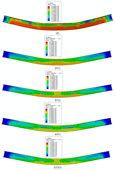 Through stress nephogram analysis, it was found that the stress concentration of the reinforced beam was distributed in the mid-span area of the lower half of the web and the bottom area of the beam. The overall stress distribution pattern is that the stress gradually increases from the upper part to the lower part of the steel beam, and decreases from the middle to both sides of the span. The highest stress appears in the lower half of the beam span. Comparing specimen P with each reinforced beam, the CFRP/GFRP cloth reinforcement effectively reduces the stress on the beam web and lower flange and improves the stress distribution. The stress cloud diagram of each specimen beam is shown in Figure 9.