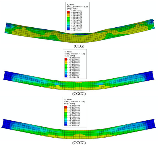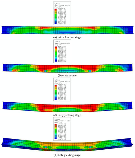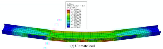 When the reinforced beam is initially loaded, stress is generated at the upper flange in contact with the loading point, and the high-stress area is concentrated at the loading point and spreads around, resulting in significant stress between the two loading points. The steel beam web plays a role in resisting shear and bending moments, resisting stress generated by force deformation, while the blue areas at both ends of the steel beam are not involved in the work and are displayed in blue. At this point, the stress in the bottom span of the steel beam is relatively small, and the CFRP/GFRP fabric is not involved in the stress, resulting in a low utilization rate of CFRP/GFRP fabric. As shown in Figure 10a. At the initial stage of applying load, the reinforced beam is in the elastic stage, and the stress in the loading point area begins to transfer downwards from the loading point to the web. The high-stress area of the web has significantly expanded, indicating that the steel beam web further participates in the work of resisting bending deformation. The balance of stress in the mid-span area of the beam also generates corresponding support reactions at the support, resulting in an increase in stress values. At this point, there was no significant deformation of the reinforced beam as a whole, as shown in Figure 10b. As the load value increases, significant bending deformation is observed in the reinforced beam, and the high-stress area at the lower flange of the beam at the loading point further expands, as shown in Figure 10c. As the load value increases, the overall stress value of the steel beam increases, and the CFRP/GFRP cloth pasted at the bottom further plays a reinforcement role. The high stress is concentrated on the corresponding CFRP/GFRP cloth at the load application position, as shown in Figure 10d. As the load increases and the bending deformation of the reinforced beam increases, the CFRP/GFRP fabric is constantly subjected to stress, which is transmitted from both sides to the mid-span. The maximum stress area appears at the mid-span loading point, ultimately leading to peeling or fracture of the CFRP/GFRP fabric. The stress at the upper web of the beam decreases slightly due to elastic recovery, as shown in Figure 10e.