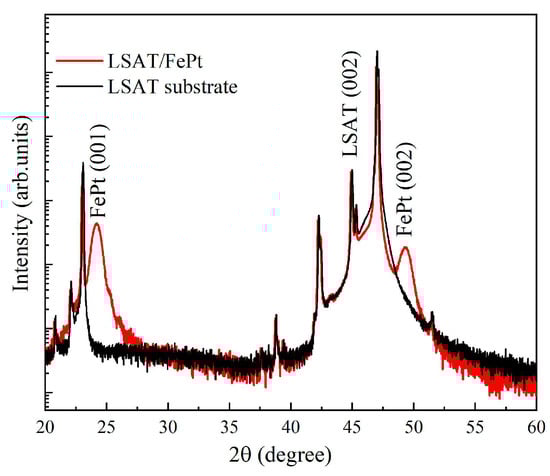 The sample is a single-layer L10-Fe0.5Pt0.5 film with thickness of 11.9 nm. The film was epitaxially grown on a 5 × 5 mm2 (La,Sr)(Al,Ta)O3 (LSAT) substrate using magnetron sputtering in a uniform DC field at a temperature of 400 °C. After the deposition process, the film was annealed at a temperature of 750 °C under vacuum conditions (2.7 × 10−8 Torr). The presence of diffraction peaks of FePt (001) and (002) at 2θ = 24.3° and 2θ = 49.4°, respectively, confirm the formation of a face-centered tetragonal (fct) L10-FePt phase [30,31,32], while the extra peaks correspond to LAST substrate as shown in Figure 1.
