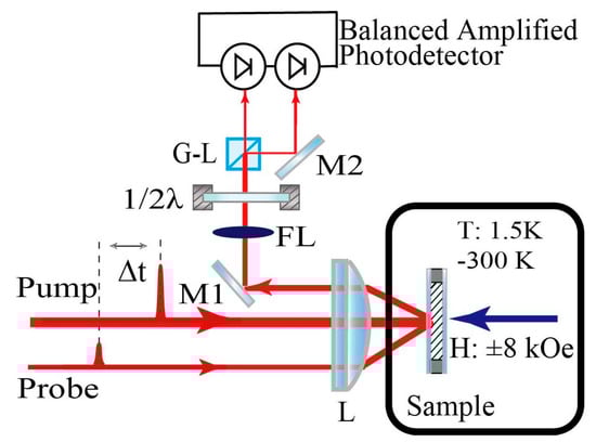 Simplified schematic of the TR-MOKE measurement setup. L: lens. M1 and M2: mirrors. FL: neutral-density filter. 1/2λ: half-wave plate. G-L: Glan prism. ∆t: time delay between the pump and probe pulses controlled by a motorized translation stage on the pump optical path.