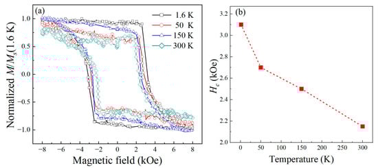 The Kerr hysteresis loops of L10-FePt alloy film were first measured under a variable magnetic field applied perpendicularly to the film plane and plotted in Figure 3a. The normalized out-of-plane hysteresis loops present nearly square and centric-symmetric shapes at all temperatures, which reveal that the sample has a strong perpendicular magnetic anisotropy. In addition, the coercivity of the films decreases from ~3.12 kOe at 1.6 K to ~2.15 kOe at 300 K as shown in Figure 3b, indicating an enhancement in magnetic anisotropy with the decrease in the ambient temperature [33,34]. According to the Heisenberg model [28,35], magnetic anisotropy is originated from SOC. Therefore, the temperature dependence of hysteresis loops indicates that the SOC strength of L10-FePt film increases with decreasing ambient temperature.