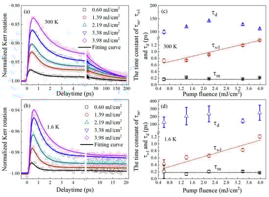The magnetization dynamics of FePt alloys at 1.6 K and 300 K can be fitted well with Equation (1), as colored solid lines shown in Figure 4a and 4b, respectively. The three extracted parameters, τm, τs−l, and τd as a function of pump fluence are plotted in Figure 4c,d by the scattered points. Compared to Figure 4a,b, the fluence dependence trends of the three time-constants do not show significant changes with temperature. The ultrafast demagnetization processes at both temperatures present time constants (τm) of approximately 200 fs, without obvious dependence of pump fluence, differing from what would be expected via the electron–phonon-mediated spin-flip scattering [8,23,29]. It should be noted that the increased demagnetization rates by increasing pump fluences here were maintained within a small variation range, which was insufficient to cause a significant decrease in spin-flip probability. Specifically, the demagnetization rates range only from 0.03 to 0.17 at 300 K and from 0.01 to 0.06 at 1.6 K.