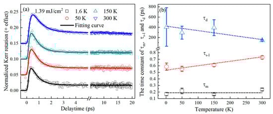 To further confirm the above finding about demagnetization and magnetization recovery at the two different temperatures, we studied the magnetization dynamics of FePt alloys with the same excitation fluence and different ambient temperature ranging from 1.6 K to 300 K, as shown in Figure 5a. All dynamic traces exhibit an ultrafast demagnetization process, as well as fast and slow magnetization recovery processes as mentioned above. It is worth noting that the maximum amplitude of demagnetization slightly increases from 0.069 to 0.094 as the ambient temperature rises, being consistent with previous reports [23]. We globally fit the temperature-dependent dynamics using Equation (1), as shown by the solid lines in Figure 5a. τm, τs-l, and τd are extracted and shown in Figure 5b.