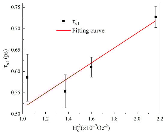 As shown in Figure 5b, τs−l exhibits a decreasing trend as the ambient temperature decreases. As discussed previously, the sample at lower temperature demonstrated stronger SOC. It is reasonable to infer that stronger SOC would accelerate the spin–lattice relaxation. Further analysis can be carried out by considering the magnetic anisotropy, which is positively correlated with the strength of the SOC. The Kerr loops shown in Figure 2 reveal that the perpendicular magnetic anisotropy increases with decreasing ambient temperature. Assuming that factors such as defects and dislocations, which would influence the pinning sites in domain wall motion, can be neglected, the coercivity and the magnetic anisotropy energy have an approximate simple relation: [39], which is consistent with the report by the ferromagnetic resonance [40]. By combining this with the relationship given by Equation (2), one can obtain a relation of . Note that since keeps minor variation in a wide temperature range, one can approximatively regard as a constant.