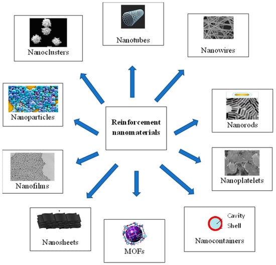 Reinforcement materials mostly used are in the form of nanoparticles, nanotubes, nanowires, nanorods, nanoplatelets, nanosheets, nanofilms, or nanocapsules [1]. The most important types of reinforcing materials are summarized in Figure 1, and the most frequently used will be briefly discussed in the next sections.