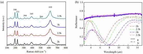 (a) Raman spectra of the VO2 thin films with different deposition times. (b) The reflectance spectra of VO2 thin films with different deposition times.