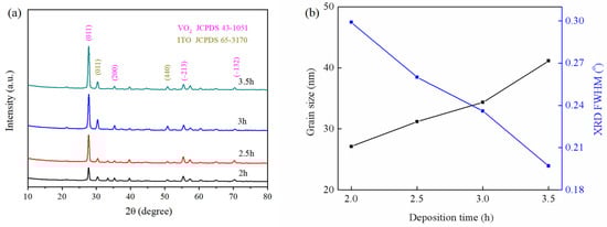 (a) XRD patterns of the VO2 thin films with different deposition times. (b) Grain sizes and XRD FWHM of the VO2 peaks with different deposition times.
