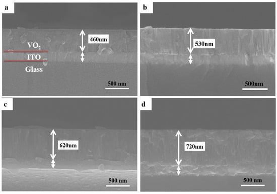 Figure 4 shows the cross-section morphology of the VO2 thin films on ITO substrates with various deposition times. The cross-section images were used to determine the film thickness and analyze the process of growth. The films were homogeneous and dense and for all films, the morphology can be characterized as compact packing of columns. Similar columnar-like growth can also be observed for the VO2 films deposited by magnetron sputtering in other research works [43,47]. The film thickness was found to vary from 460 to 720 nm as the deposition time increased from 2 to 3.5 h.