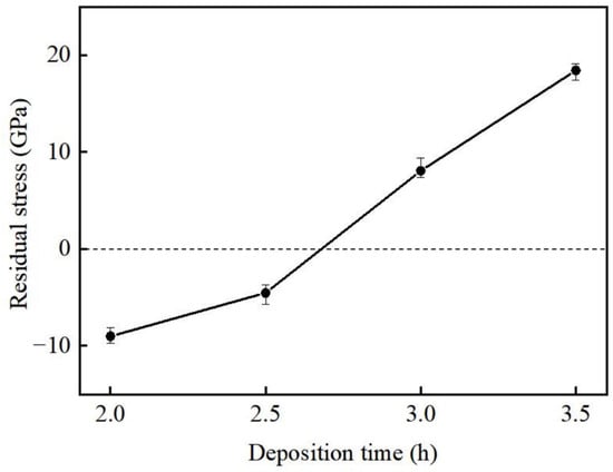 The X-ray diffraction method was performed to measure the residual stress (more details in the Supporting Information (Figure S2)). The residual stress obtained is plotted in Figure 6 as a function of deposition time. The thinnest film had the highest compressive stress of −9.009 GPa, while the film resulting from a 3.5 h deposition time had the highest tensile stress of 18.42 GPa. This indicates that as the film thickness increased, the residual stress presented the phenomenon of “compression-to-tensile stress transition.”
