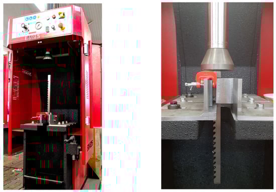 The thesis of the process of creating the innovative method comprised the effective removal of the weld root (face) in open areas with different types of welded joints, with a guarantee of maintaining shape accuracy and high requirements to maintain the quality of the surface layer while ensuring the safety of workers and the non-obtrusiveness of the process to man and the environment. According to the stated thesis, a non-standard multi-edged tool for post-weld surface finishing was created. This cutting tool, with a specialized design adapted to specific conditions, was necessary to use for the processing of various complex surfaces of different dimensions, shapes, and qualities within one machining cycle. The multi-edged tool for post-weld surface finishing, due to the appropriate shape and cutting teeth locations, correctly adjusted to the finishing conditions on the basis of strength calculations. This tool was used in the following conditions: intermittent cuttings caused by the shapes and properties of the weld bead surfaces, uneven machining allowances, variable numbers of simultaneously working (active) edges, discontinuities of the machining process, periodically changing or impacting loads on cutting, the heterogeneity of the weld bead material, and the increase in tool wear. The Hydraulic Broaching machine BM25 NARGESA was chosen for the implementation of this non-standard cutting tool (Figure 1).