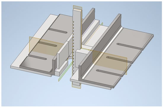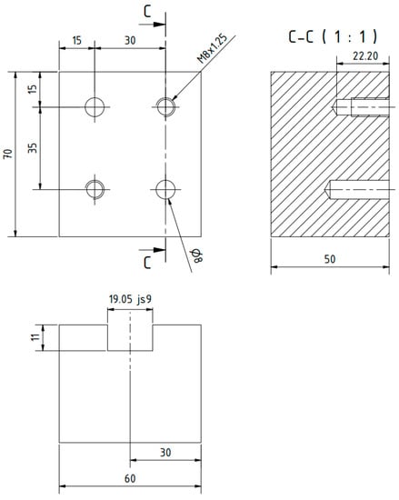 On the other hand, the right angle iron was equipped with guides featuring a centrally located groove. These guides facilitated the vertical (cutting) movement of the innovative cutting tool. The groove dimensions were 14.28 ± 0.09 mm and 19.05 ± 0.09 mm in width. The guide itself was made of stainless steel with enhanced hardness. It was mounted on the outer side of the angle iron using two 9 ± 0.05 mm pins and two M8 screws, as depicted in Figure 5.