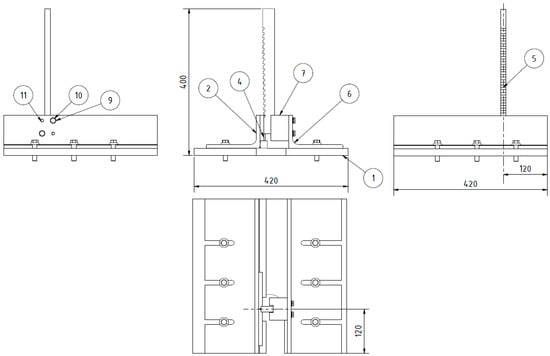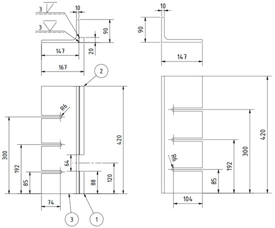 The subject of the project is illustrated in the manufacturing example presented in Figure 3 and Figure 4. The elements and components are identified as follows: 1—top of the machine table, 2—design structural element I (a left unequal-arm steel angle bar), 3—hot-rolled steel profile (longer arm of the angle bar), 4—square steel bar (shelf for holding workpieces), 5—multi-tooth cutting tool, 6—design element II (right angle steel unequal arm), 7—design element III (guide with a slot of the width of the multi-tooth cutting tool to guide and support it), 8—M8 threaded holes, 9—washer, 10—M8 hexagonal head screw, 11—rolling pin.