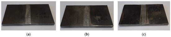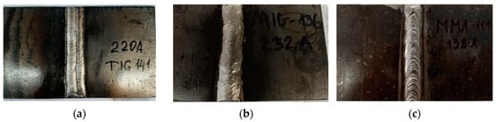 The weld-joint samples after applying different welding methods: (a) TIG; (b) MIG; (c) MMA.