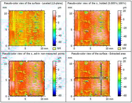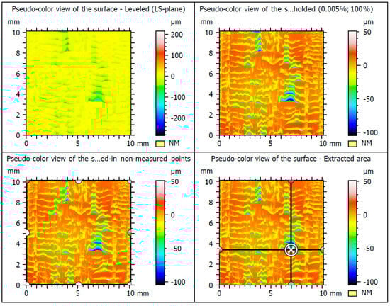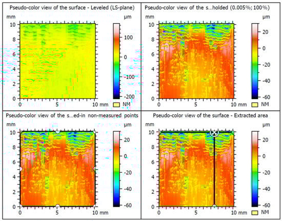 In order to conduct a study on the innovative post-weld finishing effect in steel specimens produced using different welding methods and its impact on the key surface quality parameters, the 2D and 3D surface roughness measurements were performed [13,14,15,16,17]. The level of selected surface roughness parameters determined its functional properties: fatigue strength, wear and corrosion resistance, contact strength, tribological properties, adhesion, and others. The problem of the influence of the roughness of the weld’s surface, after innovative machining of its face, on the fatigue strength of the joint was one of the most important technological and structural issues. We could generally say that a lower roughness contributed to an increase in strength. However, in the range of values of the roughness parameter Ra = 2.5–5 μm, the fatigue strength was more influenced by the residual stresses [18,19], their distributions after depth, the micro- and macrostructures of the surface layer, and the degree of its hardening (microhardness distribution) [20].