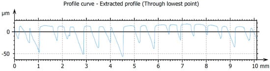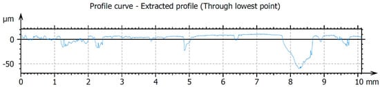 The results of testing the surface unevenness of the weld obtained with TIG welding, after removing the face using the innovative method, are presented in Figure 10 and in the graphs shown in Figure 11 and Figure 12. The measurements of the profile unevenness in the specified area were conducted in both the Y-axis (vertical) and the X-axis (horizontal) directions, considering measurements from the lowest point and from the surface. The detailed results of these measurements are summarized in Table 1.