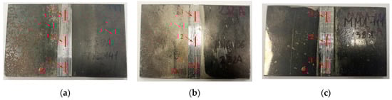 The samples prepared for X-ray diffraction residual stress tests with marked areas of measurement: (a) TIG; (b) MIG; (c) MMA.