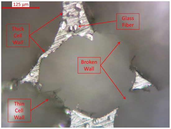 Figure 3 shows the optical microscope images of PU composite foam at different wt% GF loading. It shows that the addition of GF reduces the cell size and wall thickness of the foam. At 30 wt% of GF, it can be observed that the wall thickness is getting thinner compared to lower GF loadings. Our findings are in agreement with others [38,40]. For a deeper investigation, Figure 4 shows the cell of the foam of PUF/30% GF at a higher magnification. From the figure, it is obvious that fibers tend to embed in the wall of the cell. In each cell, thick, thin and broken walls can be found. Thin and broken walls are responsible for the deterioration of the strength of the foam.