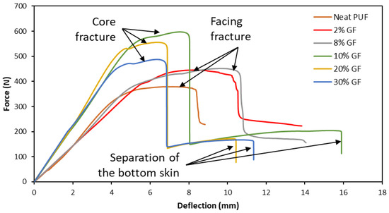 From the force–deflection curves, core ultimate shear strength and facing strength can be calculated based on the ASTM D7249 standard [36]. Figure 6 shows graphs of force, core shear ultimate strength and facing strength by increasing GF content. The force, core shear stress and facing stress have a similar tendency: to increase up to 10 wt.% loadings and subsequently drop. The sandwich of 10 wt.% of GF improved the force, core shear strength and facing strength by 43%, 39% and 40%, respectively, compared to the sandwich with neat PUF. The presence of GF improved the flexural strength of the sandwiches. The embedded GF on the PUF wall and the decrease in the cell size contribute to the improvement in the flexural properties. Meanwhile, the decrease in the force, core shear stress and facing stress of the sandwiches at 20 wt.% of loading and above was due to the agglomeration of GF. An excessive loading of GF on the foam disrupts the cell structure, reduces the wall thickness and furthermore even breaks the wall, thus creating a stress concentration in the foam wall and decreasing the flexibility of the foam [41]. It is worth remarking that the facing stress, although it is different in value, reaches its maximum at almost the same deformation level (around a 8 mm deflection). After this level, degradation starts with a high rate in the neat PUF and is slower as the wt.% of GF increases up to 10 wt.%, where a sudden fracture occurs.