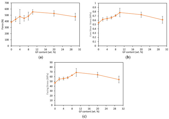 Flexural properties of the composite sandwich: (a) Force, (b) Core shear stress and (c) Facing stress (at different wt.% of GF).