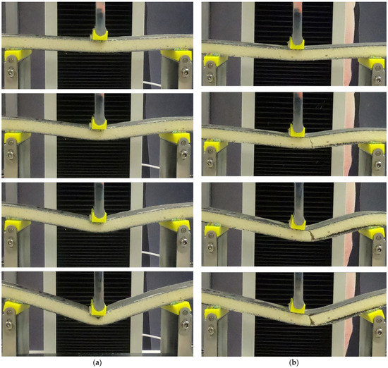 A failure mechanism comparison of the composite sandwich with facing failure at 8 wt.% and core failure at 10 wt.% is shown in Figure 9. For the facing failure sample, Figure 9a shows that the failure starts from the crushing of the foam core and is followed by the break of the top-facing skin material. Further bending to the sample compressed more of the core foam. Meanwhile, for the core failure sample (Figure 9b), the failure started from the fracture of the core due to transverse shear stress, which was then followed by a partial separation of the bottom-facing skin. With the increase in the deflection, the bottom-facing skin was opened, followed by a full separation of the right side of the load pin on the bottom-facing skin and partial top-facing skin. From Figure 5, it can be observed that deflection increases with the increase in GF for GF lower than 8 wt.%. The increase in the deflection was related to the improvement in the compression strength composite foam. The localized bending on the top of CFRP facing due to localized indentation was detained as the compression strength of the PU composite foam increased. As a result, the facing failure occurred at a higher deflection.