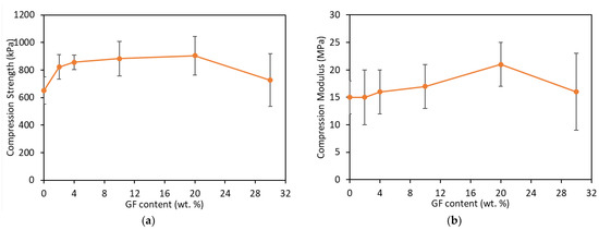 To thoroughly understand the behavior of the sandwiches under flexural loading with a different wt.% of GF, the compression properties need to be investigated as correlated to the damage mechanism in bending. The compression strength was calculated with the stress at 10% of strain divided by the sample’s cross-section area. The compression modulus was evaluated from the slope of the linear section of the compression stress–strain curve. Figure 10 shows the compression properties of the sandwiches by the increase in wt.% of GF. An enhancement in compression strength was observed, as seen in Figure 10a. An increase of about 26% compared to PUF only occurred with the addition of 2% of GF, but then the increase was not as much as before with the increase in wt.% of GF. The maximum increase was observed at 20 wt.% GF, with about a 38% increase compared to PUF only before it dropped at 30 wt.% of GF loading. Other researchers [39,43] also reported an increase in the compression strength of PUF due to reinforcement by GF. There was a slight increase in the compression modulus up to 10 wt.% GF loading. A 40% improvement was observed at 20 wt.% GF loading followed by a drop at 30 wt.%.