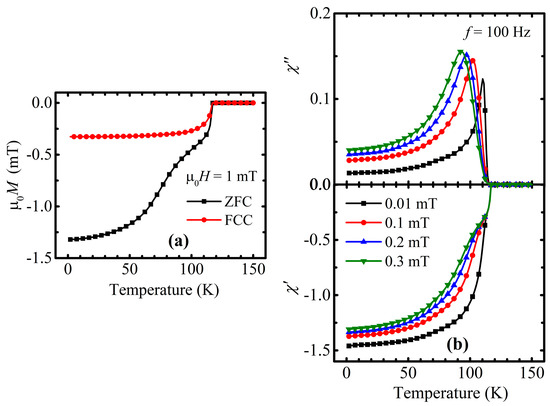 (a) Temperature dependence of dc magnetization recorded at 1 mT of external field in zero-field cooling (ZFC) and field-cooling (FCC) modes. (b) Temperature dependence of an imaginary part χ″ and a real part χ′ of ac susceptibility (ac magnetization normalized by corresponding ac field value) measured with an ac field of 100 Hz frequency and with the following amplitudes: 0.01 mT (black squares), 0.1 mT (red circles), 0.2 mT (blue triangles), and 0.3 mT (green inverted triangles). Recorded susceptibility value extends diamagnetic limit because presented data are not corrected for demagnetizing field.