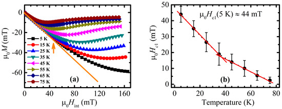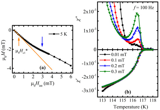 The initial magnetization curve was obtained within the small range of the external dc field at 5 K and is represented as a function of the internal field µ0Hint along the procedure of the demagnetizing effect correction: Hint = Hext—DM (Hext—applied dc magnetic field, M—measured magnetization, D—demagnetizing factor) (Figure 2a). A fitted Meissner line (orange line in Figure 2a) was utilized for the experimental estimation of the demagnetizing factor D, which turned out to be equal to 0.27 and is valid for all the results in the present work, since the sample was measured in the same direction with regard to the applied external dc field.
