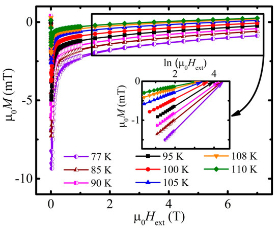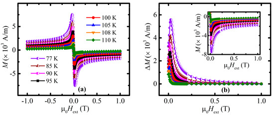 (a) Field dependence of magnetization at the following temperatures: 77 K (violet half-filled circles), 85 K (brown half-filled triangles), 90 K (magenta half-filled squares), 95 K (black squares), 100 K (red circles), 105 K (blue triangles), 108 K (orange inverted triangles), 110 K (green rhombs), and 112 K (violet stars). (b) Field dependence of ΔM obtained for the corresponding temperatures. Inset in Figure 6b shows the data, which were immediately used for the ΔM(µ0Hext) curves’ calculation.