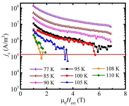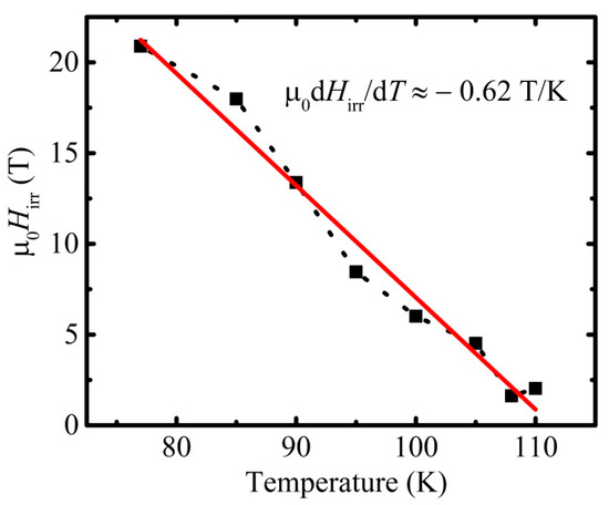 With the assumption for the criterion of an appearance of irreversibility as high as jc = 1.5 × 105 A/m2, which excludes the overestimation of the obtained results, one can obtain the irreversibility field line presented in Figure 9 with the irreversibility field, Hirr, at 77 K as high as 21 T. The data for the temperatures below 100 K were obtained by a cross of the linear extrapolation of the logjc(H) dependence with the line of the constant value jc(H) = 1.5 × 105 A/m2.