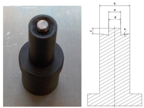 Photo showing the tool used for friction welding. Parameters of the tool presented: (a) tool pin cylindrical, diameter M4; (b) tool collar cylindrical, diameter of 10 mm; (c) pin height, 1.9 mm; (d) head angle, 3%; (e) flange contact surface to be welded is conical with a concave angle of 10 degrees.