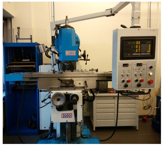 The friction welding process was carried out on an FWF 32J2 JAFO JAROCIN universal milling machine produced by Marat Sp. z o.o. Jarocin, Poland (Figure 2), with a motor power of 2.2 kW and a feed motor power of 0.25 kW. The parameters studied during the experiment were the tool speed and feed rate.