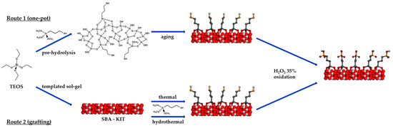 Two different procedures, one-pot synthesis (route 1) and post-modification in thermal and hydrothermal conditions (route 2), as represented in Figure 2, were carried out for the synthesis of Pr-SO3H silica.
