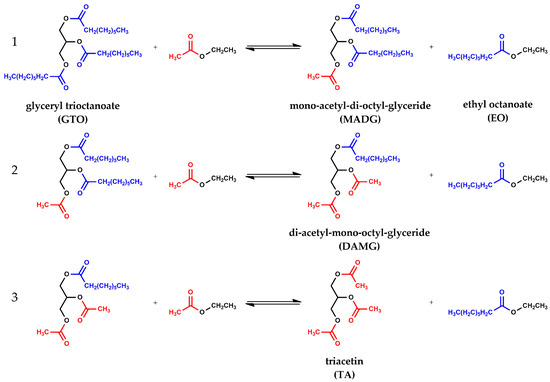 Consecutive interesterification steps between: (1) glyceryl trioctanoate (GTO) and ethyl acetate (EA) to give mono-acetyl-di-octyl-glyceride (MADG) and ethyl octanoate (EO); (2) MADG and EA to give di-acetyl-mono-octyl-glyceride (DAMG) and EO; (3) DAMG and EA to give triacetin (TA) and EO.