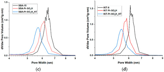 N2 absorption–desorption isotherm of: (a) SBA-15-based materials; (b) KIT-6-based materials; (c) pore size distribution of SBA-15-based materials; (d) pore size distribution of KIT-6-based materials.