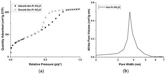 Am-Pr-SO3H textural properties: (a) nitrogen absorption–desorption isotherm; (b) pore size distribution.