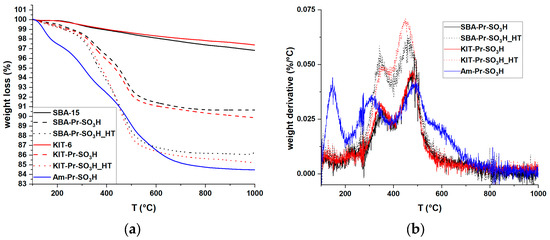 According to the TGA results shown in Figure 7, the two pristine supports behave similarly, with a continuous loss of weight with temperature, likely due to a gradual removal of water from the condensation of silanol groups [56]. As given in Table 1, similar weight losses due to the removal of the sulfonic groups are observed for the hybrid catalysts, with larger losses in the case of the hydrothermal grafting. As clearly shown by the first derivative curves of both types of catalysts, the weight losses occur in correspondence with two distinct temperatures (ca. 350 and ca. 470 °C), accounting for two favored sites of quite regular placement of propyl-sulfonic groups on the support surface. On the contrary, in the case of Am-Pr-SO3H, three weight losses occur at ca. 150, 310, and 480 °C, and in a wider range at ca. 600 °C. The presence of these losses is in accord with the irregular structure of the material and the subsequent irregular distribution of propyl-sulfonic groups. In addition, the presence of a weight loss at ca. 150 °C is related to the presence of crystallization water, confirming once more the main presence on superficial propyl-sulfonic groups, which can easily interact with moisture [49].