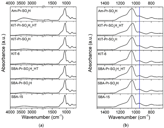 It is not so straightforward to detect the differences among the pristine and functionalized KIT-6- and SBA-15-based samples, due to the sensitivity of the technique (although specifically appropriate for surface analysis), but also due to the superimpositions of the sulfonic-related peaks with silica signals that make them not so evident up to certain concentrations, as has already occurred in other studies [43,49,64]. In any case, for the KIT samples after functionalization, a certain shift of the main SiO2 peak (1055 cm−1, grey line in Figure 9b) and the change in the relative intensity of the silanol peak (955 cm−1, blue line in Figure 9b) could be highlighted and it can be related to propyl–SO3H. Indeed, it has already been noticed that the interactions with functionalizing moieties can weaken the Si-OH spectral signals and modify the surface Si-O-Si original arrangement [49,65,66].