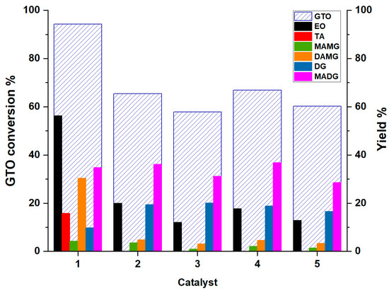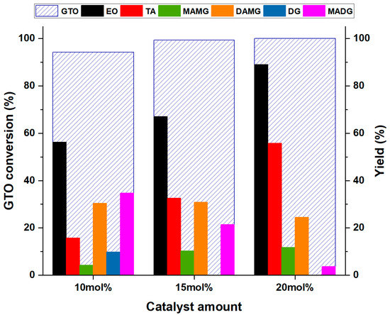 Conversion of GTO increases with the amount of catalyst, although this trend is not so evident, since 94.2% conversion is observed with 10 mol% catalyst, rising to 99.3% and 100% with 15 mol% and 20 mol% catalyst, respectively. As far as the main products EO and TA are concerned, a gradual increase in their yield with the catalyst amount is observed. The yield of EO from 56.2% increases to 67.0 and 88.9% with 15 mol% and 20 mol% catalyst, respectively. The yield of TA increases as well, from 15.7% to 32.5% and 55.7% 15 mol% and 20 mol% catalyst, respectively. Regarding the intermediates, different trends are observed. In particular, the increase in MAMG can be explained by considering a shift of the equilibrium of (R5) and (R6) as the catalyst increases, with the consequent decrease in MADG and DG, with the latter one disappearing completely with 15 mol% catalyst. The DAMG trend deserves a different consideration; although consumed by the (R8) reaction, its amount remains almost stable with 15 mol% catalyst and begins to decrease with 20 mol% catalyst amount. This confirms, once again, that the conversion of DAMG to TA is the rate-determining step.