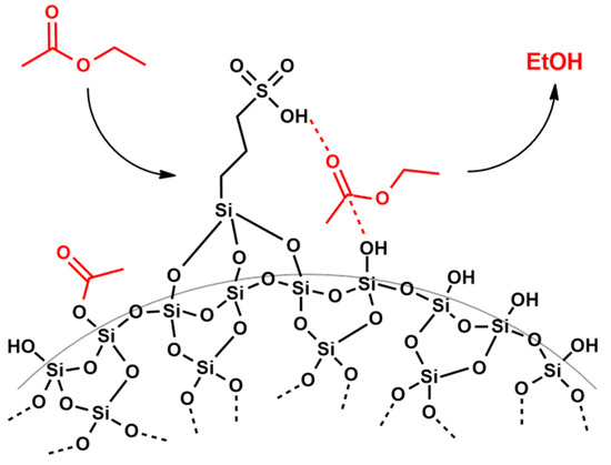 These last results indicate that as the amount of catalyst increases, the rate of the interesterification reaction increases. It is possible that the lower amounts of catalysts do not guarantee enough sulfonic and silanol groups on the silica support that would achieve the silanolysis of ethyl acetate, providing further ethanol, as schematized in Figure 12.