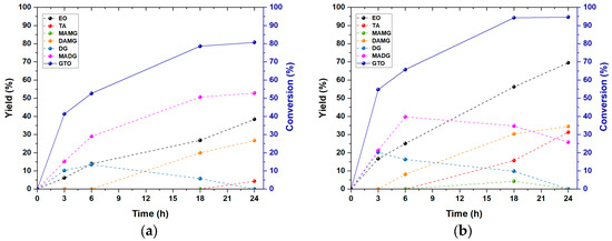 When the reaction is carried out without ethanol, DGs reach a maximum yield of 13.4% after 6 h and MAMG is not detected. During the reaction in ethanol, a higher presence of DG and MAMG is observed, reaching a maximum yield of 20.2% after 3 h and 4.3% after 18 h, respectively. Regarding MADG, it is the main product of the reaction without ethanol, with a yield of 52.8% after 24 h, while it reaches a maximum yield of 39.7% after 6 h in the reaction with ethanol. This difference can be ascribed to the fact that, in the presence of ethanol, GTO and MADG react with ethanol present at the beginning of the reaction to give DG (R4) and MAMG (R6), respectively. On the other hand, DAMG increases steadily in both cases, reaching 26.7% and 34.5% yield after 24 h for the reaction without and with ethanol, respectively.