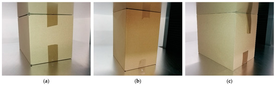 Before the test, the packages were folded manually by one person, and the top and bottom flaps were taped since this is the standard practice and ensures box integrity (Figure 1). However, taping does not directly influence the BCT. The packages were conditioned according to the laboratory standard of TAPPI T402 [27], which determines the standard conditioning and testing atmospheres for paper, board, pulp hand sheets and related products. Therefore, a humidity of 50% and a temperature of 23 °C was set in the preconditioning chamber.