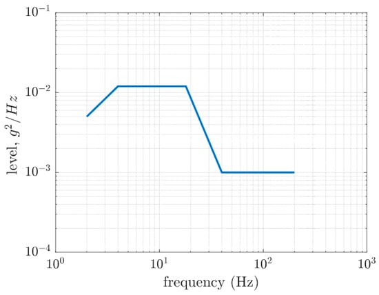 In the ISO 13355 test, a vibrating table was excited for the effective frequency domain with a cardboard box sample placed on it. The setups of the test were predetermined, which applied, for example, to the duration of the test, the ambient temperature, the humidity and the acceleration of the power spectral density. During the test, the box sample cannot translate horizontally and must be closed. The vibration table must be stiff, and the gravity center of the specimen must be positioned in the center of the table. According to ISO 13355, if the experimental data for reproducing the effects of transportation are absent, the test duration and power spectral density of the vibration table may be assumed, as shown in Figure 2. Therefore, the data demonstrated in Figure 2 were used in the presented numerical study as the representative data for reproducing the environmental vibrations during transportation.